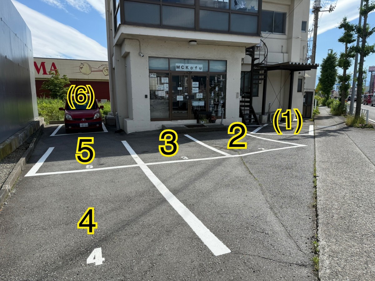 (1番と6番は車の前に更に駐車されるとお帰り時に出れなくなります。1番と6番はスタッフが使用させて頂く事がございます。)