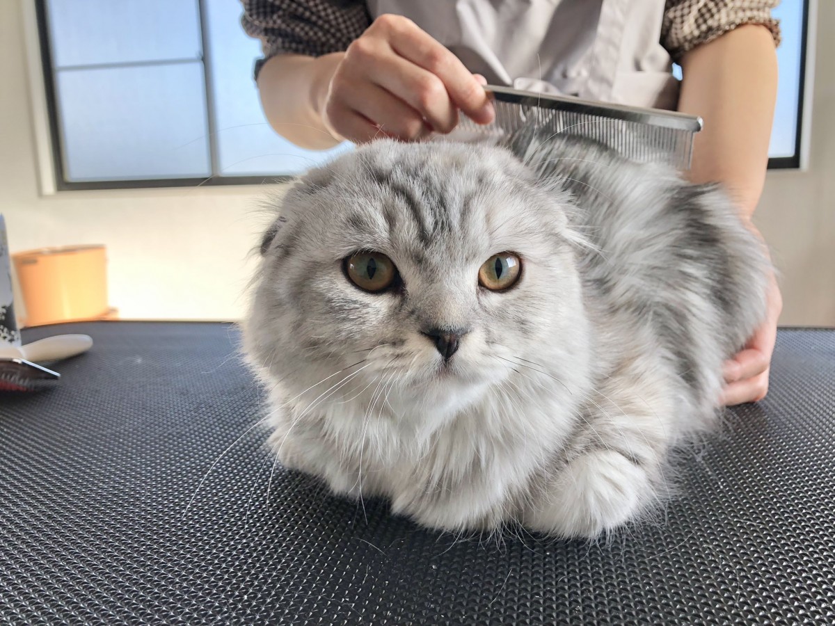 スコティッシュのラムネちゃん♪2回目のご利用です。今回は爪切り、耳掃除、足裏のタフトカット、ブラッシングのをさせて頂きました。ブラッシング後はフワフワで更に可愛くなりました♡